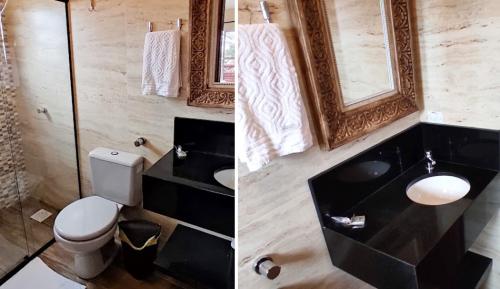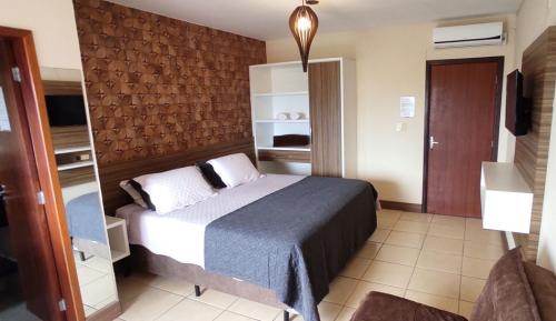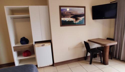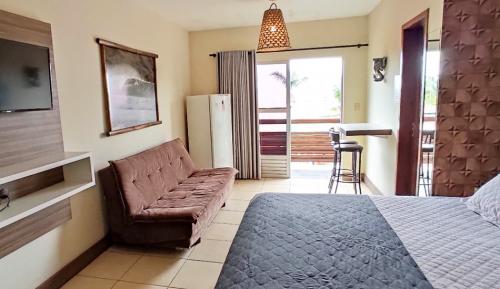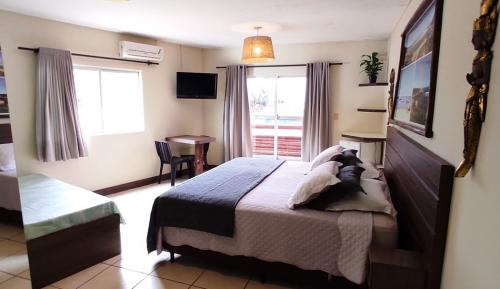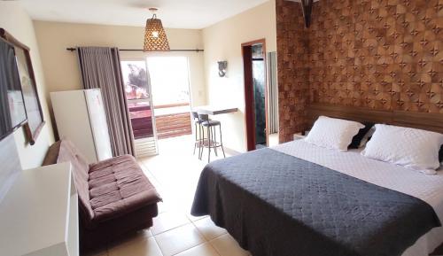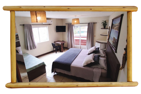 Suítes amplas com aproximadamente 40m², com sacada, com móveis muito aconchegantes. Possuem uma cama de casal e uma bi-cama, colchões confortáveis, armário com cabideiro, TV led 32” com controle remoto, frigobar, mesa com cadeiras e banheiro privado.